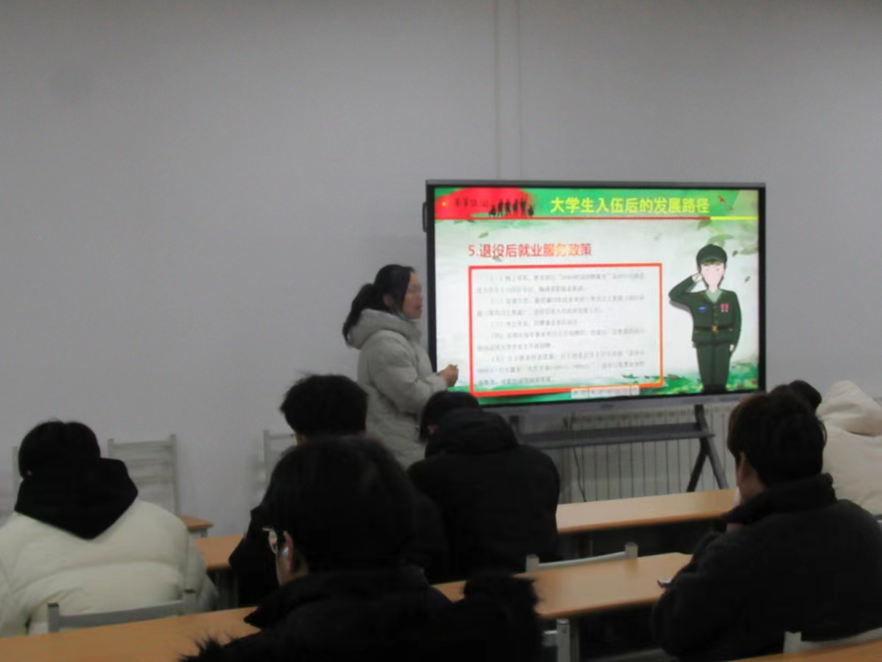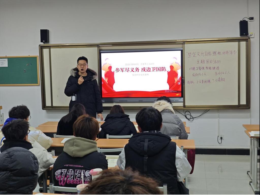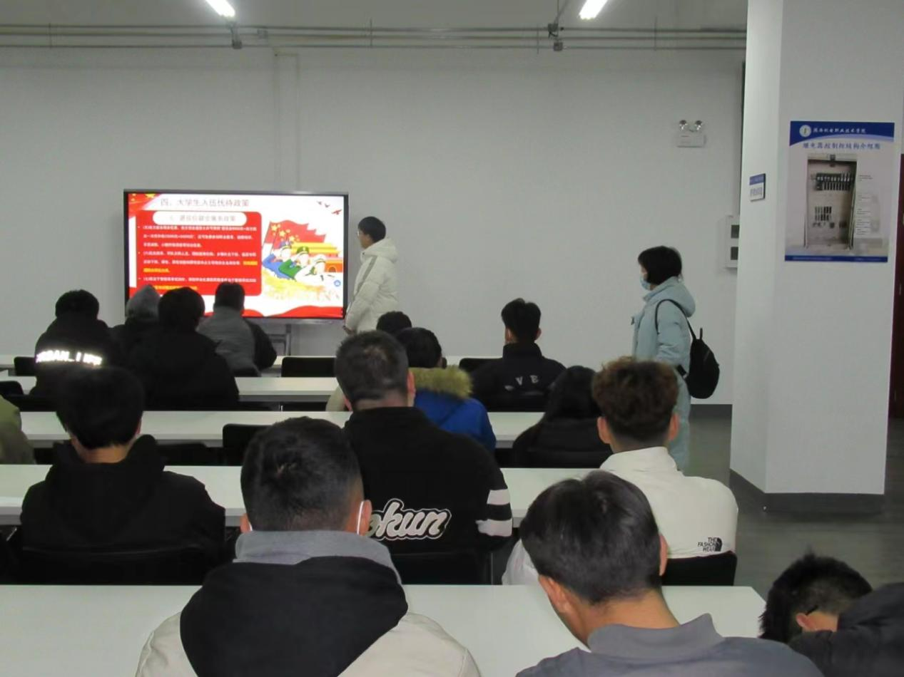 班会上,各班辅导员老师通过图片、视频等方式,给同学们宣传普及了老员工应征入伍的征集对象、报名程序、入伍途径、优待政策、发展路径等相关内容,鼓励员工踊跃参军入伍,报效国家。