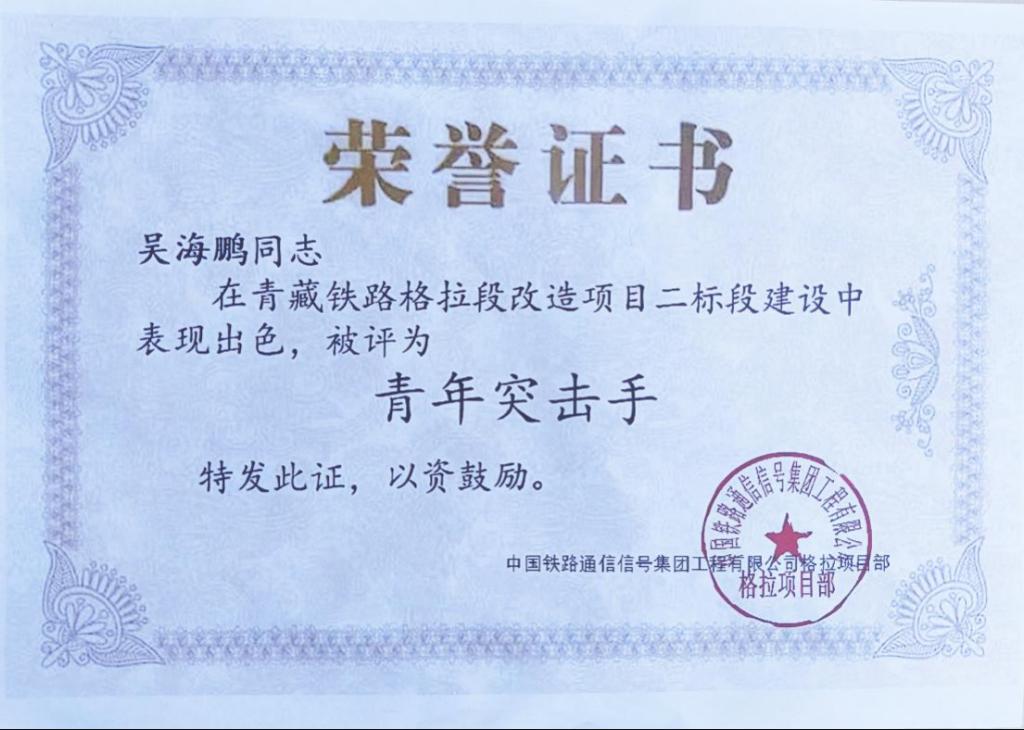2022年12月,在中国铁路通信信号集团工程局有限公司中青藏铁路格拉段的道岔及信号系统改造施工中,由于临近初冬,青藏高原天气开始变得异常寒冷,加上高原缺氧,好多职工以身体适应不了高原气候为由婉拒前往西藏地区工作。而初出茅庐的吴海鹏不畏艰难、义无反顾,主动请缨参与到了青藏铁路格拉段道岔及信号系统改造施工项目中。
